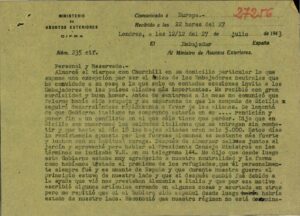 Les facilitamos este interesante documento, un telegrama del Embajador en Londres, Jacobo Fitz-James Stuart y Falcó, Duque Alba, donde da cuenta de un almuerzo con Winston Churchill en su domicilio particular, lo que suponía una excepción pues no era su costumbre. Invitaba sólo en contadas ocasiones a los embajadores de los países aliados más importantes. Allí trataron pormenores de los temas de índole política, opinando que nuestro Régimen no estaba dominado por el Eje y nos calificó de “fieros e indomables”: