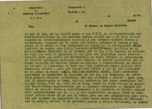 Hablamos de la prensa; por lo que a la inglesa se refiere me dijo que dada la libertad de que goza era imposible parar ciertos ataques pero que sabía que últimamente se había evitado la publicación de ciertos artículos molestos para España. Se mostró agradecido por la buena reacción de nuestra prensa en general y concretamente en cuanto se refiere al bombardeo de Roma que dijo lamentaba mucho, hubiera sido necesario llevar a cabo por imperativo bélico y que si los italianos no se ponen en razón temía, aun lamentándolo mucho, fuera necesario continuar el bombardeo de ciudades en las que por desgracia se perderían grandes valores artísticos. (No soy católico – añadió – pero aprecio la importancia de Roma, capital admirable por todos conceptos). Recalqué cuanto V.E. me decía en su telegrama sobre el (debe faltar un grupo) del Generalísimo manifestando que la censura referente al régimen liberal se refiere única y exclusivamente a lo ocurrido en España. Aceptó contestándome que lo… y que consideraba un gran error el comparar países entre sí ya que lo bueno para uno era perjudicial para otro, así por ejemplo en Inglaterra no puede haber mejor sistema de Gobierno que el actual, motivo de su grandeza pasada y actual fortaleza, es decir una Monarquía limitada y permanente, tan necesaria para los pueblos por hacer posible la continuidad. Me dio como ejemplo el caso de los EE.UU. en el que, según él, las elecciones de representantes (¿) ya preocupan más hasta cierto punto que la guerra, mientras en Inglaterra – dijo – “podría yo desaparecer y las cosas seguirían su curso, sin trastorno ni sacudidas para el país”.